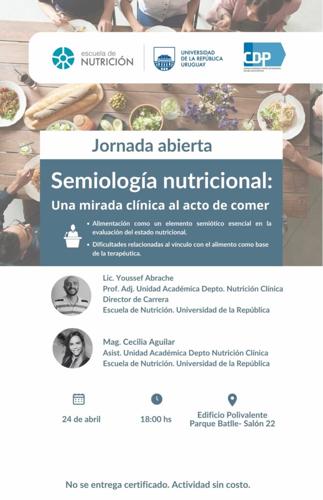 Les anunciamos la próxima Jornada Abierta a realizarse en el mes de abril con la propuesta: «Semiología nutricional: Una mirada clínica al acto de comer»» a cargo del Lic. en Nutrición Prof. Adj. Unidad Académica Depto. Nutrición Clínica Youssef Abrache y Mag. Lic. en Nutrición Asist. Unidad Académica Depto Nutrición Clínica Cecilia Aguilar.
