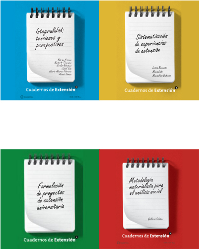 ![]() | Cuadernos de extensión. Nº 1 – Integralidad: tensiones y perspectivas. Nº 2 – Metodología materialista para el análisis social. Nº 3 – Sistematización de experiencias de extensión. Nº 4 – Formulación de Proyectos de Extensión Universitaria | Ver |
